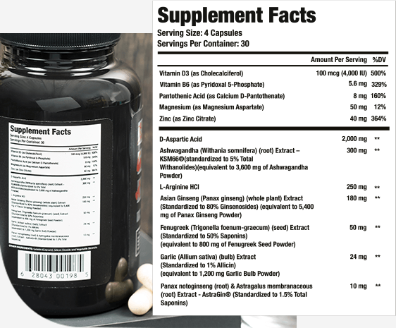 Panax Ginseng Extract, Vitamin D3, Vitamin B6, Garlic Extract, and Pantothenic Acid which come together to supply complimentary support to bolster testosterone synthesis, fuel the growth of lean muscle mass, heighten mental wellness, and raise daily energy levels!
